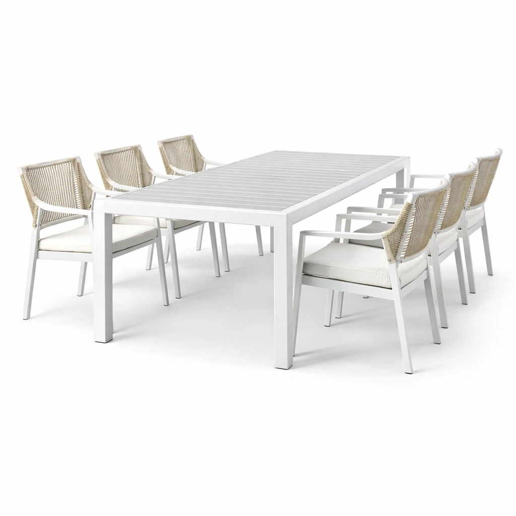 Dieses Esstisch-Set ist für den Außenbereich geeignet. Der Tisch besteht aus wetterfestem Aluminium. Die Sitzflächen der Stühle sind mit Polypropylen-Seil eingefasst, was für Langlebigkeit sorgt. Der Tisch misst 200 cm x 100 cm x 75 cm und die Stühle 55 cm x 60 cm x 85 cm.