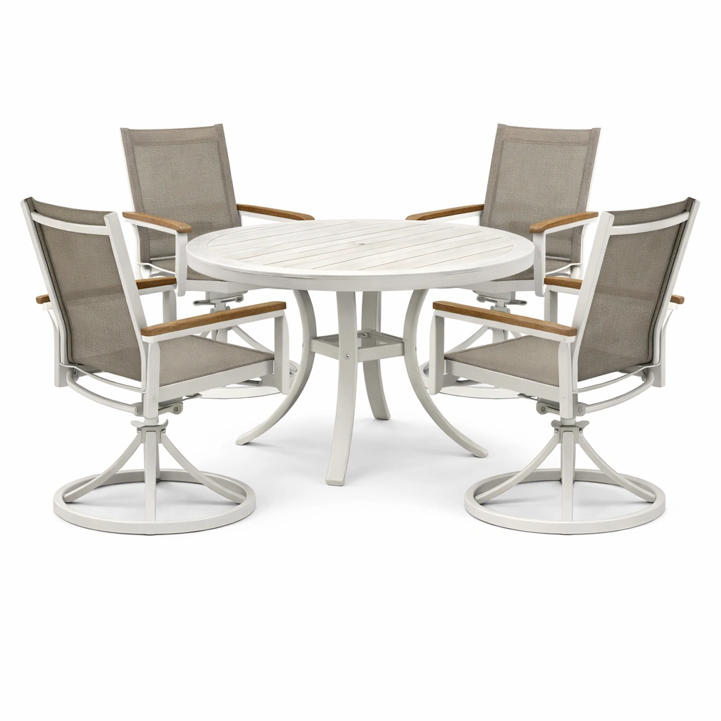 Material: Aluminium, Tischplatte aus hochdichtem Polyethylen (HDPE), Textilene-Gewebe, Armlehnen aus Kunststoff in Holzoptik
