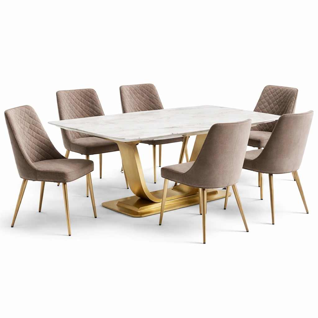 Das Esstischset besteht aus einem rechteckigen Tisch und sechs Stühlen. Die Tischplatte ist in Marmoroptik gestaltet und hat eine goldene Stahlbasis.