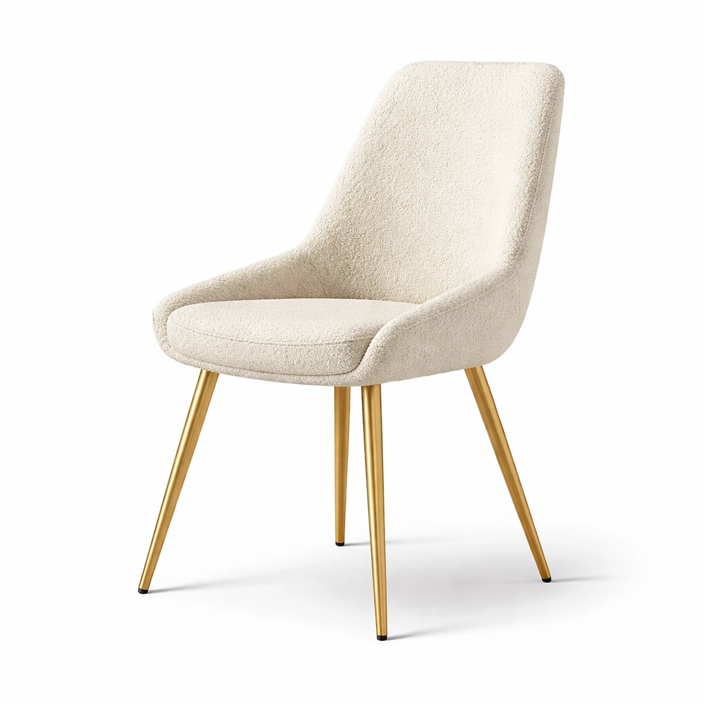 Der Stuhl verfügt über einen Sitz und eine Rückenlehne aus Bouclé-Stoff. Die Beine sind aus goldfarbenem Metall gefertigt.